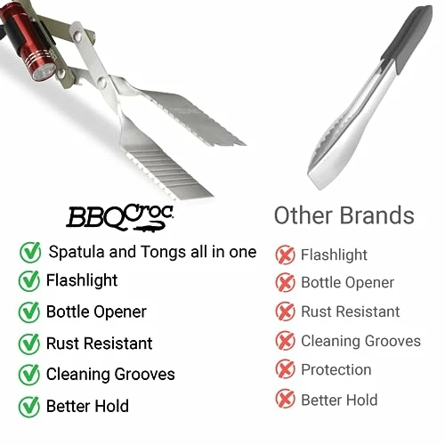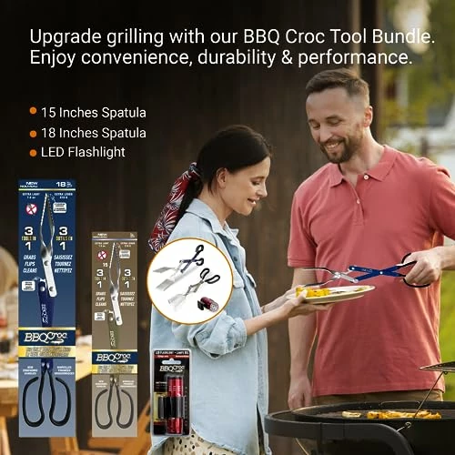 - ENHANCED GRILLING EXPERIENCE: Experience grilling like never before with the BBQ Croc’s ergonomic non-slip handles and serrated edges on the spatulas. The new bottle opener adds a convenient twist, allowing you to enjoy your favorite beverages while tending to the grill. With an extended length of over 18 inches, your hands stay safe from the heat.