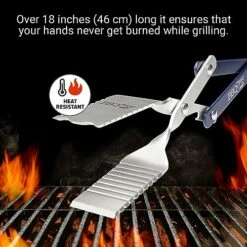 Designed with ergonomic non-slip handles and serrated spatula edges, you can confidently secure your food for flipping or lifting. The tool’s over 18-inch length keeps your hands protected from the heat, reaching into the back of the grill with ease. The addition of a built-in bottle opener adds to its convenience.