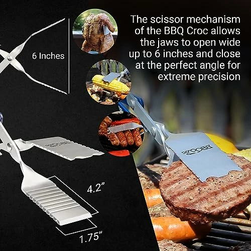 - QUALITY AND DURABILITY: Crafted with premium food-grade aluminum alloy, the BBQ Croc is built to last. It’s rust-proof, dishwasher safe (discoloration may occur), and is heat resistant. The scissor mechanism opens wide, up to 6 inches, ensuring a strong and secure grip. Lift chicken, roast, or even grab food from deep pots with minimal effort.
