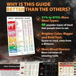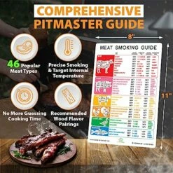 - MUST-HAVE FOR PROS AND NOVICES: Whether you’re an expert meat smoker or just getting started, this handy reference guide is an essential accessory for you. Everything you need to know is included in this weather-proof magnet. It contains relevant smoker temperatures, cooking times, wood pairings, and internal temperatures recommended by pitmasters. Saving time from searching on your phone, computer or flipping book pages, you can glance at the chart to find detailed information in seconds.