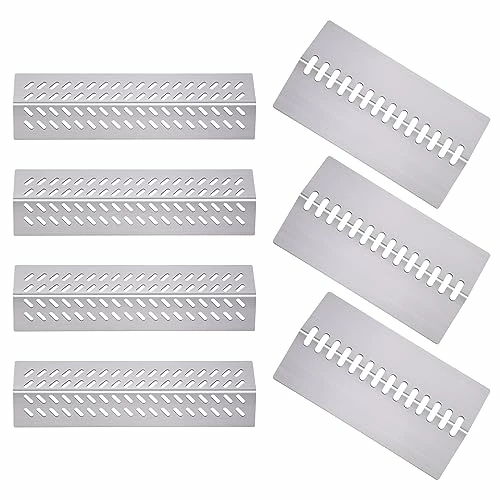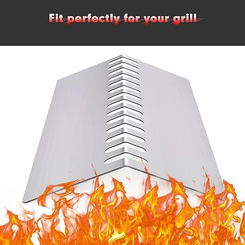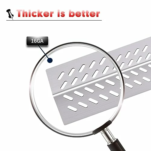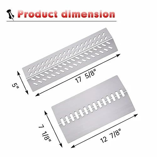 - Material: BBQ heat plates for gas grill are made of durable stainless steel, thicker than other bbq grill parts, 4 pack Grill heat shield replacement L 17 5/8″ x W 5″ x H 1 1/4″/ 17.625 inch x 5 inch x 1.25 inch, 3 pack heat shield flame tamer 12 7/8″ x 7 1/8″