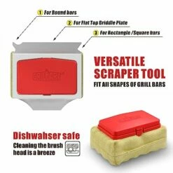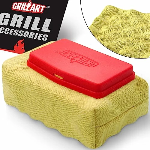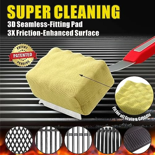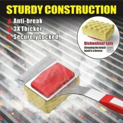- Durable and Sturdy – The long stainless steel handle never bends or breaks, keeping you away from heat sources. Built-in scraper for removing cold build-up residue. Brush cleaning head is made of heat resistant foam, wrapped in heat resistant cloth and is reusable for safe use on hot grills (preheat grill to over 400 degrees Fahrenheit and then turn off all burners for your safety.