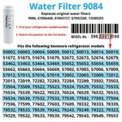 Details: Kenmore refrigerator water filter (part number 9084) fits Kenmore refrigerator models: 50002, 50003, 50004, 50009, 50012, 50013, 50014, 50019, 51672, 51673, 51674, 51679, 52672, 52673, 52674, 52679, 53462, 53463, 53464, 53469, 55652, 55653, 55654, 55659, 55662, 55663, 55664, 55669, 57002, 57003, 57006, 57009, 57012, 57013, 57016, 57019, 72002, 72003, 72009, 72012, 72013, 72019, 72282, 72283, 72284, 72289, 73502, 73503, 73504, 73509, 75522, 75523, 75524, 75529, 75532, 75533, 75534, 75539, 76522, 76523, 76524, 76529, 76532, 76533, 76534, 76539, 77532, 77533, 77539, 77592, 77593, 77594, 77596, 77599, 77602, 77603, 77609, 78332, 78333, 78339, 78532, 78533, 78539, 79242, 79243, 79249, 79322, 79323, 79329, 79532, 79533, 79539, 79542, 79543, 79549, 79553.