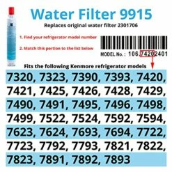 Details: Kenmore water filter 9915 has NSF 42 and 53 certifications. It reduces chlorine taste and odor, cysts and lead. Water filter 9915 is for select Kenmore top-freezer refrigerators. Replace every 6 months, or more often if water flow slows noticeably. Follow package instructions when you install this genuine Kenmore water filter. Previous part number: 2301706.