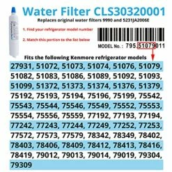Details: This Kenmore refrigerator water filter (part number 9990) fits the following Kenmore refrigerator models: 27931, 51072, 51073, 51074, 51076, 51079, 51082, 51083, 51086, 51089, 51092, 51093, 51099, 51372, 51373, 51374, 51376, 51379, 75192, 75193, 75194, 75196, 75199, 75542, 75543, 75544, 75546, 75549, 75552, 75553, 75554, 75556, 75559, 77192, 77193, 77194, 77242, 77243, 77244, 77249, 77252, 77253, 77572, 77573, 77579, 78342, 78349, 78402, 78403, 78406, 78409, 78412, 78413, 78416, 78419, 79012, 79013, 79014, 79019, 79304, 79309.