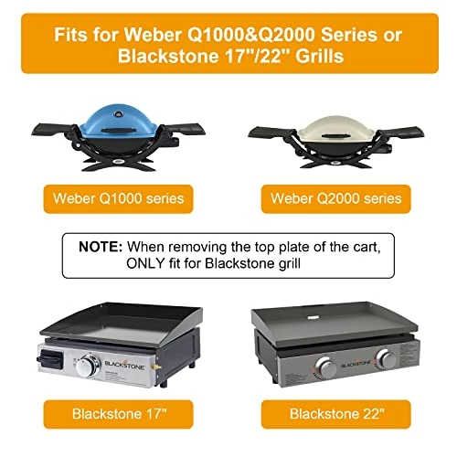 - 【Fits Perfectly】Suitable for Weber Q100, Q1000, Q1200, Q2000, Q2200 (Q100&Q200) series grills, Also fit for blackstone 17″ and 22″ grills (Note: When removing the top plate of the griddle car, ONLY fit for Blackstone 17”/22” grills, NOT for Weber series)